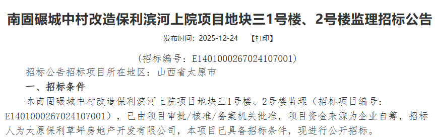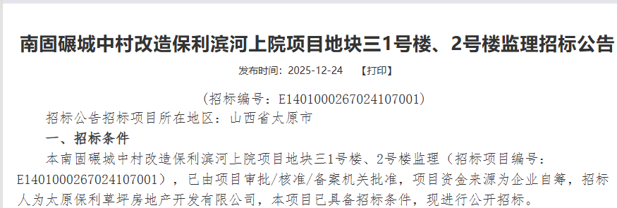 就在前一日,全国公共资源交易平台发布了《南固碾城中村改造保利滨河上院项目地块三1号楼、2号楼施工招标公告》、《南固碾城中村改造保利滨河上院项目地块三1号楼、2号楼监理招标公告》。