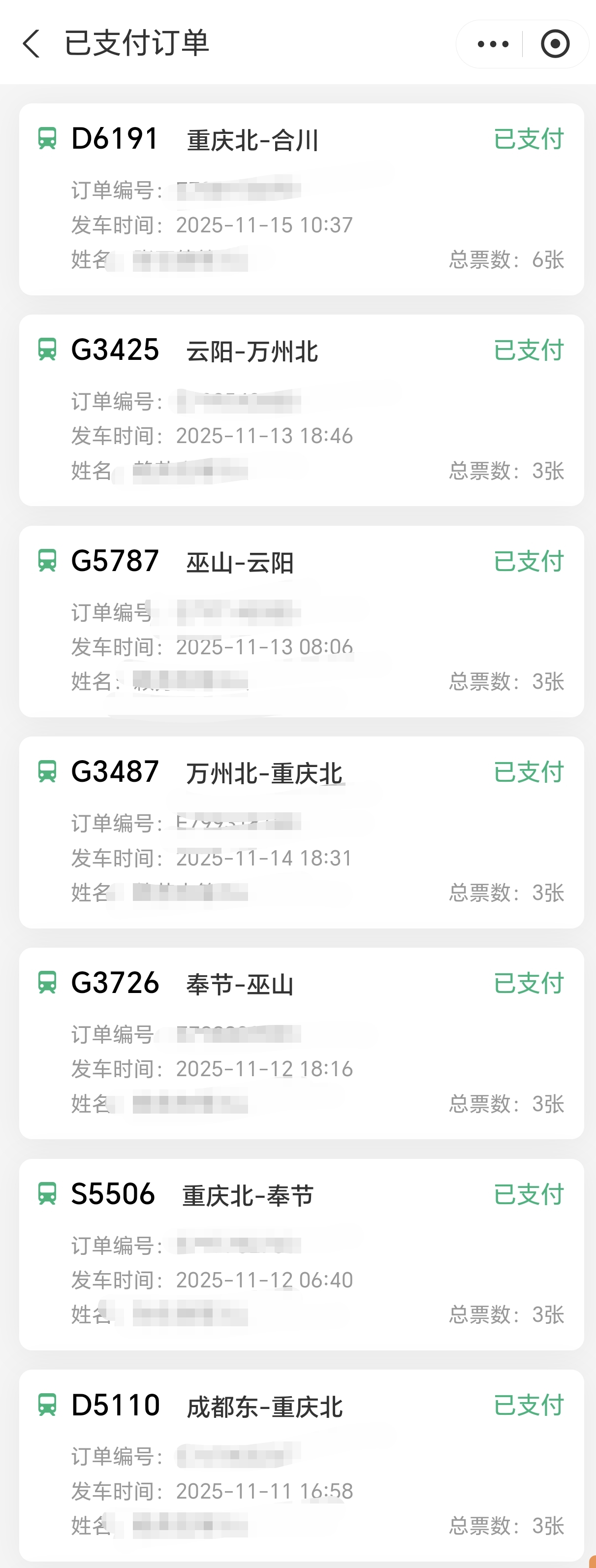 孙女士晒出24张动车票订单