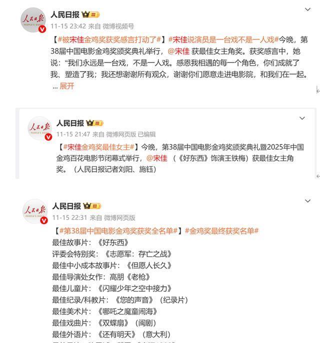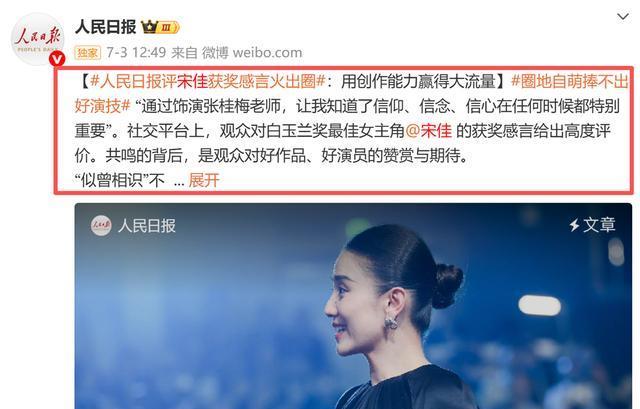 就在舆论持续发酵之际,人民日报在宋佳获金鸡奖影后不到24小时内3次提及她,措辞平实却意味深长。