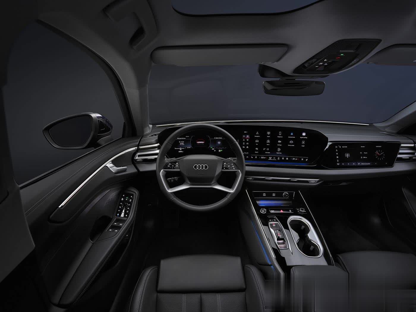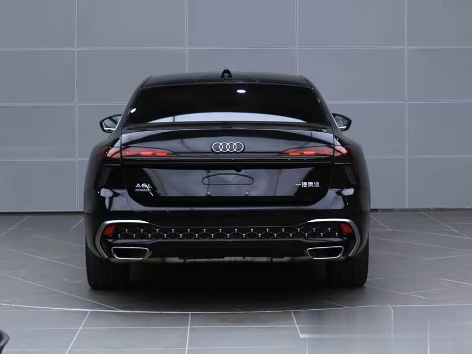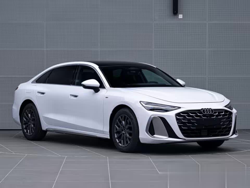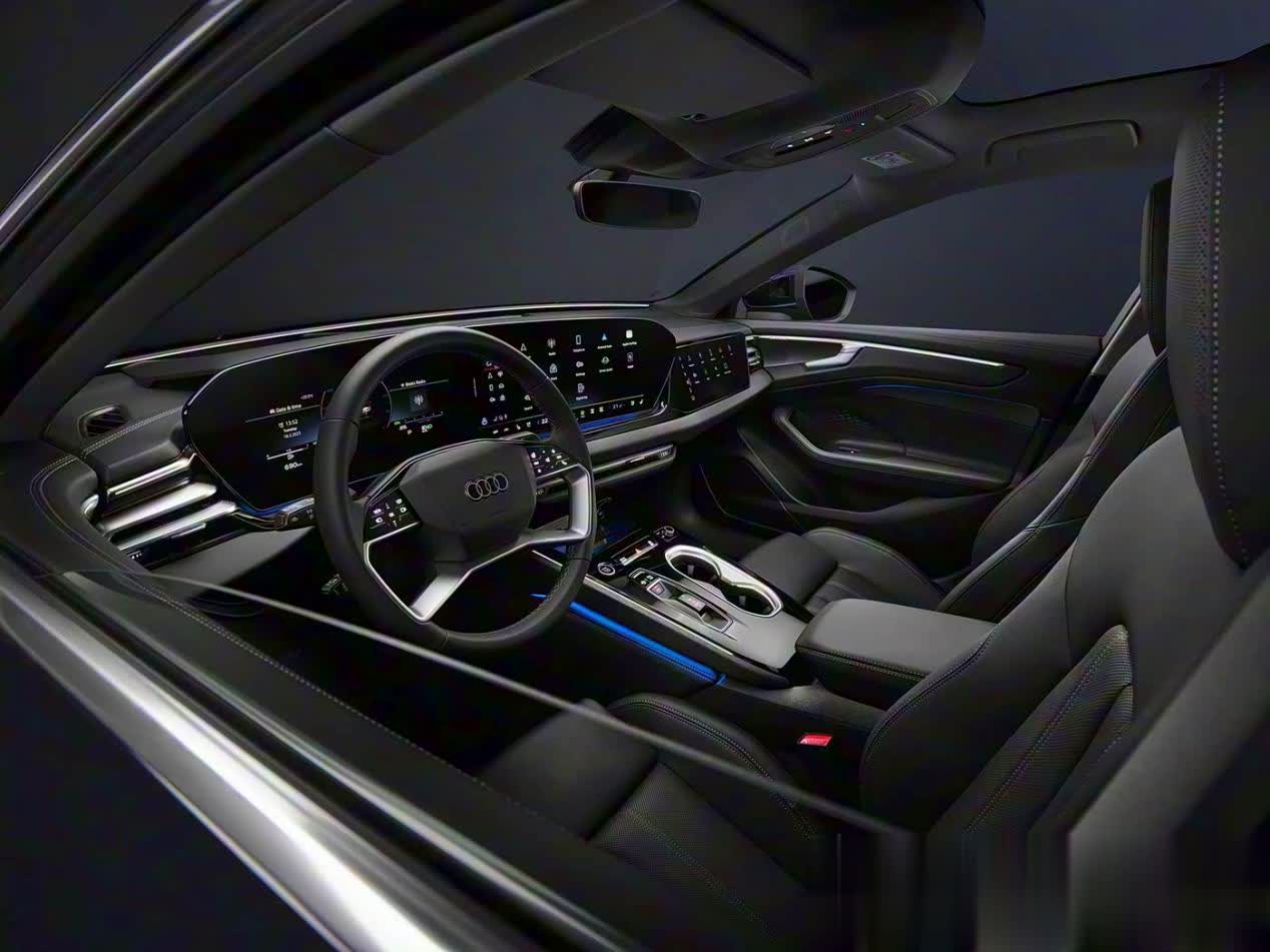 外观设计迎来颠覆性革新,彻底告别现款车型的沉稳商务调性,以年轻化、运动化姿态完成转型。前脸采用极简设计语言,硕大的多边形进气格栅内部填充熏黑蜂窝状饰条,奥迪标志性的四环车标上移至格栅上边框并与之融为一体,营造出强烈的视觉聚焦感。大灯组采用凌厉的倒梯形造型,倒L型LED日间行车灯勾勒出独特的灯语辨识度,前包围两侧的L型金属装饰板则进一步强化了运动气场,让整个车头兼具攻击性与精致感。