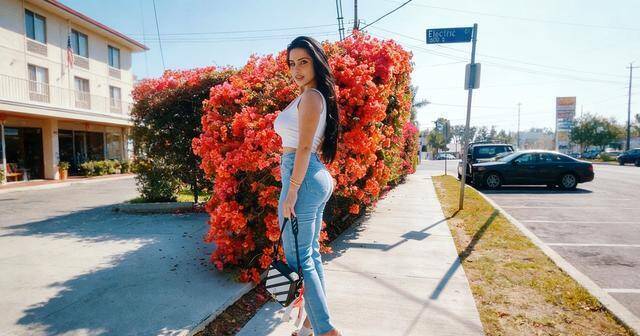紧身牛仔裤,把细腰丰臀交待得清清楚楚。